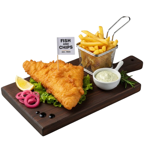 Torsk filé, cheddarost, picklad rödlök, salladsblad, gurka, majonnäs, inkl. fries Läs mer